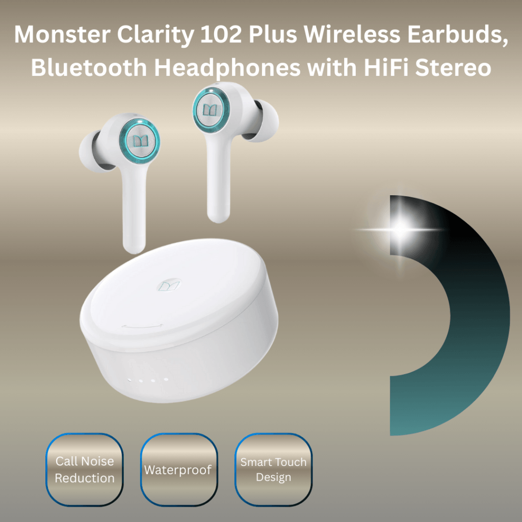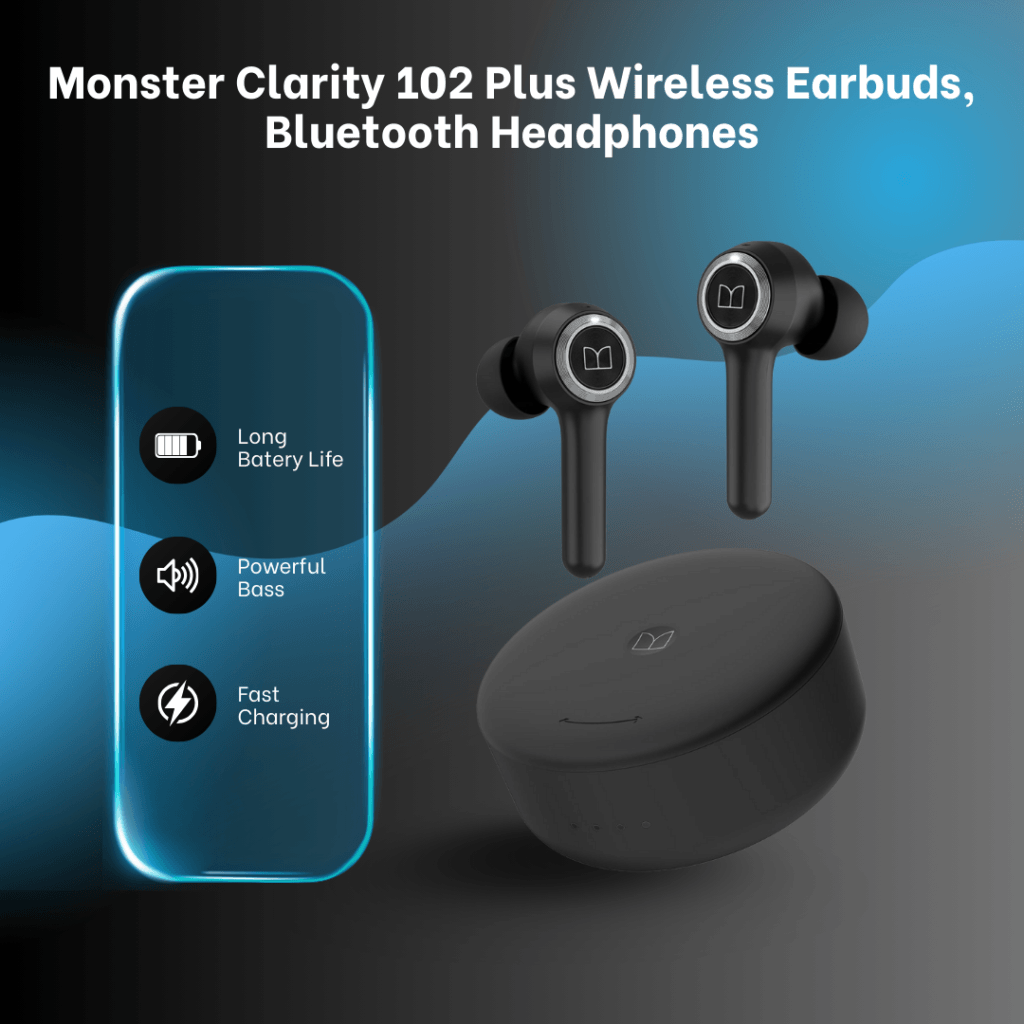 Monster Clarity 102 Plus Earbuds deliver Pure Monster Sound with crystal-clear mids and highs, powered by a digital audio processor and professional drivers. 4-mic AI calls ensure your voice is always clear, and press-button controls make managing music and calls easy. Enjoy 30 hours total playtime with fast charging, IPX6 water resistance, and a featherweight ergonomic design for all-day comfort. Bluetooth 5.4 provides stable, low-latency connection with effortless one-step pairing.