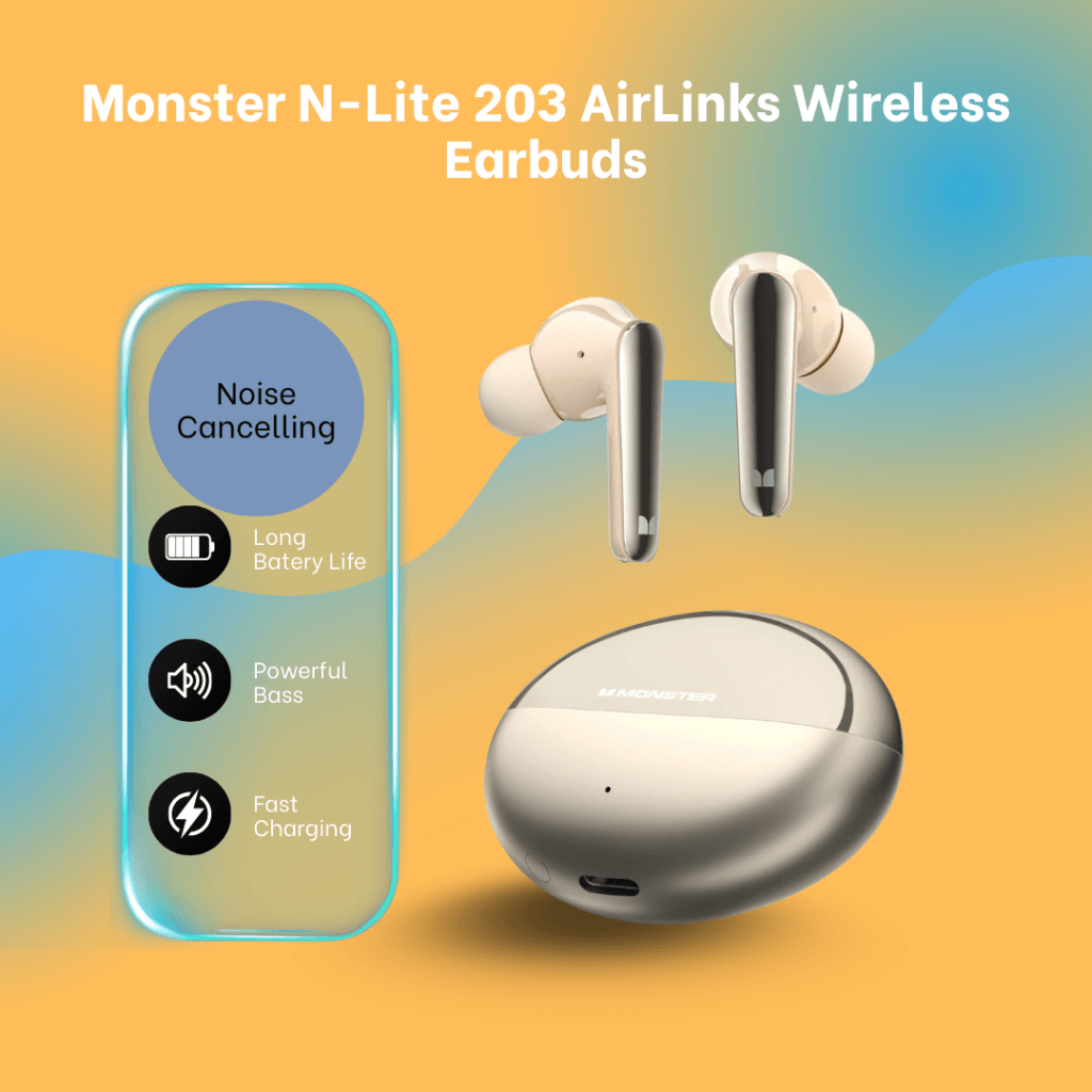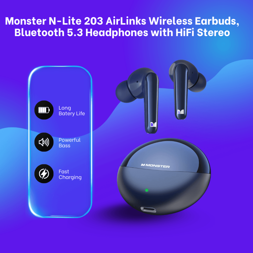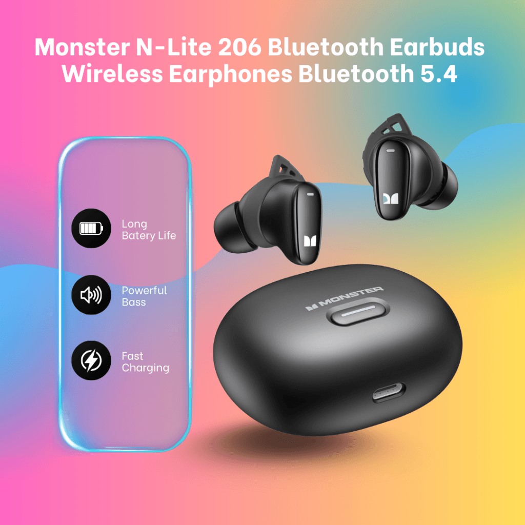 Monster N-Lite 206 Earbuds deliver deep, rich bass with 10mm drivers and DSP amplification for minimal distortion. Ergonomic design with 3 ear tip sizes ensures a secure, comfortable fit. Touch controls make managing music and calls effortless. Enjoy up to 25 hours of playtime, Bluetooth 5.4 for stable, low-latency connection, and IPX6 waterproofing for sweat and rain protection—perfect for workouts or daily use.