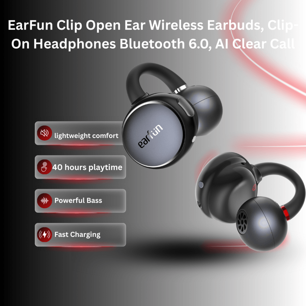 Clip-On Earbuds with ultra-soft liquid silicone and a C-shaped titanium memory wire deliver a secure, pressure-free fit for all-day comfort. Enjoy Hi-Res sound with LDAC and 10.8mm drivers for rich, immersive audio with reduced sound leakage. Bluetooth 6.0 offers faster, more stable connections with dual-device multipoint and Google Fast Pair (Android). AI-enhanced dual mics ensure clear calls, while the EarFun app lets you customize controls.