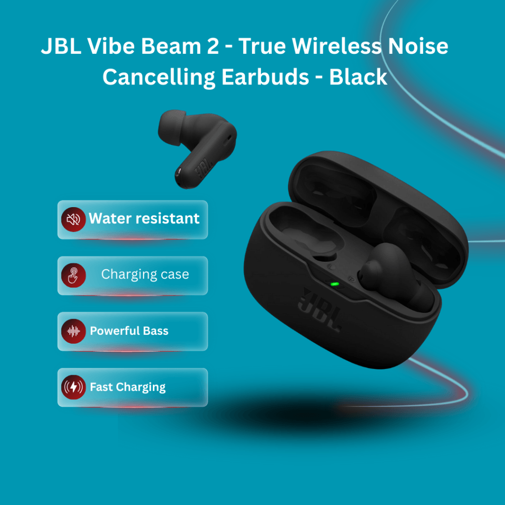 BL Vibe Beam 2 Earbuds deliver powerful JBL Pure Bass with 8mm drivers. Active Noise Cancelling with Smart Ambient lets you block noise or stay aware when needed. 4 microphones ensure clear calls even in noisy environments. With IP54 water and dust resistance (case IPX2), they’re built for daily use. Enjoy up to 40 hours of total playtime with fast charging—just 10 minutes gives 3 hours of listening.